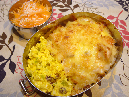 シーフードピラフとクリームシチューの残り物でドリアのリメイク弁当。