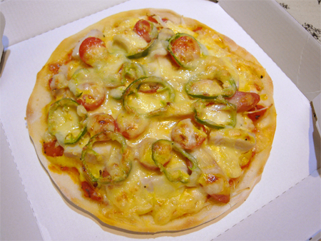 トマトソースにピーマン、ウインナー、ミニトマトがのったスタンダードなピザ。