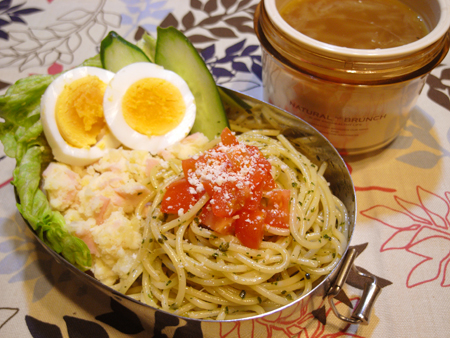 パスタにバジルのペースト、ポテトサラダにアンチョビマヨソースを。
