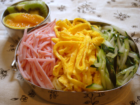 せめて弁当は涼しくなる物が食べたいってことで、冷やし中華の弁当に。