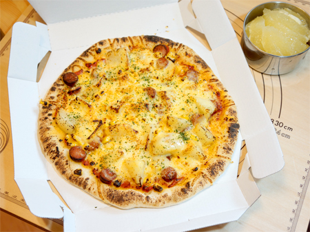 ピザ弁なんて久しぶりだ、というかピザ作るのがかなり久しぶり。具材はジャガイモ、ソーセージ、コーンでマヨソースとチーズをトッピングして焼いております。焼き上がりにパセリをちらして完成。