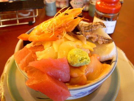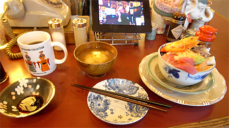 さてネットでチャックしておいたうなぎ米花へさっそく向かいます。こちらは特に行列もなく普通に入れるお店のよう、店内に入るとすぐに愛想のいい中国人らしき店員さんが対応してくれました。店内は独特の雰囲気で写真が所狭しと飾られてインテリアの置物もアジアンチックな感じ。常連客と愛想のいい店員さんのやりとりなんかを聞いてるうちにすぐ出てきました海鮮丼!なかなか美しい盛り付け。店員さんが「写真とっていってね!」と言うので遠慮なくパシャパシャと撮影させていただきましたよ。マグロに海老、シャコ、あと貝が数種類ボリュームもあってどれもなかなか新鮮で美味しかったな、特にマグロは脂がよくのってました流石築地。