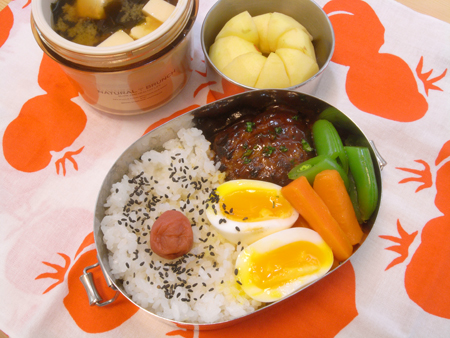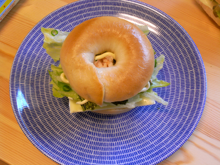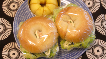 昨晩頑張ってベーグルを焼いておいたので、朝は具材をサンドするだけで弁当完成。
