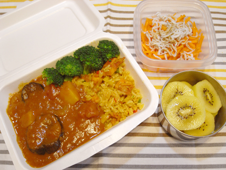 冷凍ドライカレーにレトルトカレーをかけた手抜き弁当。