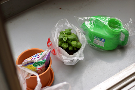 鉢、土、バジルの苗、如雨露を買ってしめて1600円くらい